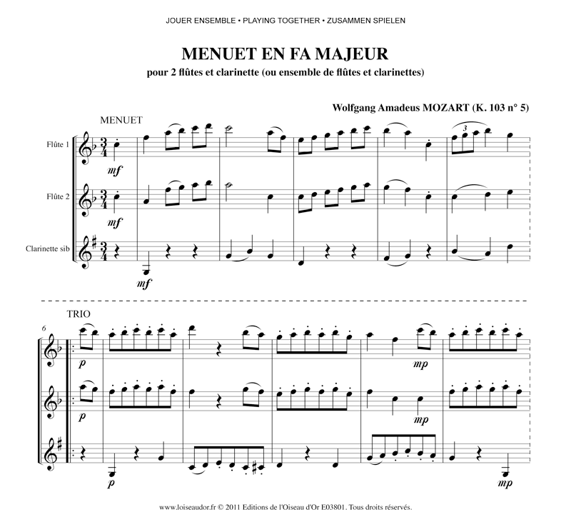 Première initiation au style mozartien : un menuet avec son trio, dans le plus pur style classique. Le menuet, très simple, est d’une parfaite régularité. Le trio est constitué d’un amusant dialogue entre les deux flûtes et la clarinette.