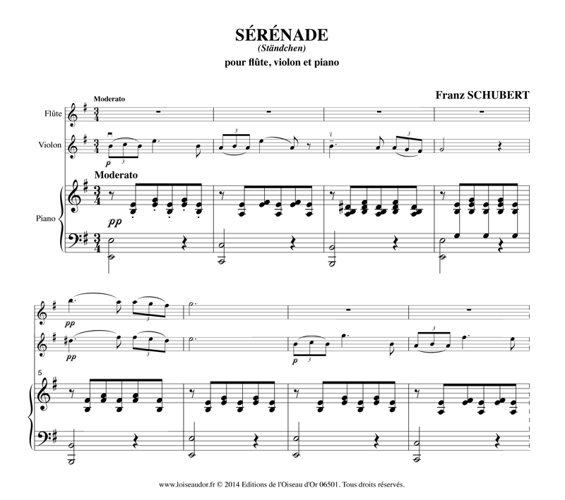 L'original est le célèbre Lied de Schubert intitulé "Ständchen (Sérénade) pour voix et piano. Dans cette transcription, sur un accompagnement régulier du piano, les deux instruments présentent la mélodie à tour de rôle et en s'unissant pour ensuite échanger véritablement lors d'un dialogue plus passionné. Les alternances majeur-mineur sont, comme souvent chez ce compositeur, toujours aussi délicates, jusqu'à la coda finale, douce et expressive.