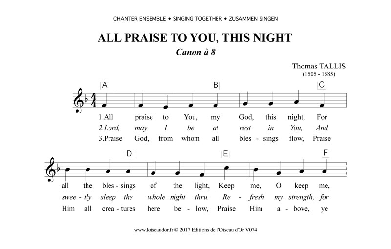 Il s'agit d'un canon à huit voix. Ce qui ne doit pas étonner quand on sait que Tallis, habile polyphoniste, a composé un motet à 40 voix. Bien sûr, il est possible de réaliser le canon à 4 voix seulement, et même moins. Une version à voix égale mettra en valeur la magnifique dissonance initiale. En résumé, de nombreuses combinaisons sont offertes par la ligne toute simple de ce canon, sans oublier des présentations spatialisées.